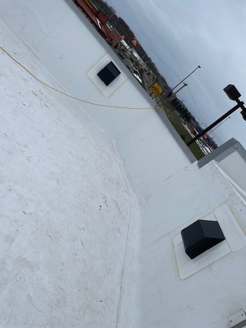 We removed existing TPO membrane on the main and freezer roof and installed RUS strip on perimeter roof/wall junction to secure membrane to roof. We mechanically attached new .060 membrane to roof and glued new membrane to walls. We also installed all new vent pipe boots and re-flashed units and curbs along with box vents an parapet walls.